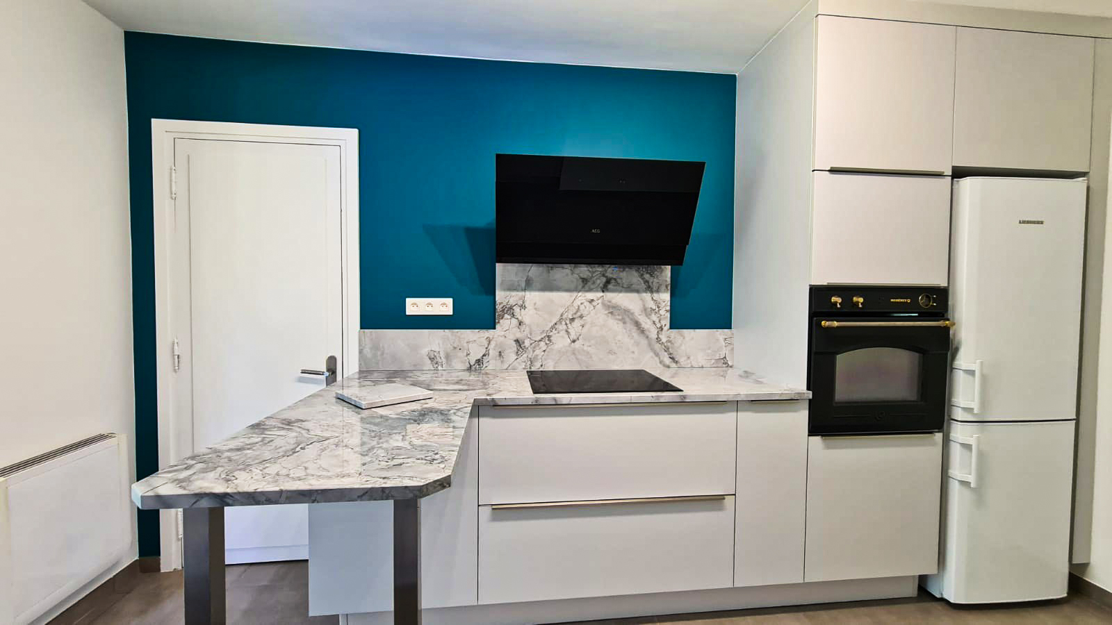 Superbe cuisine chic en marbre. Hotte inclinée. Evier sous plan. Plan de travail effet marbre.