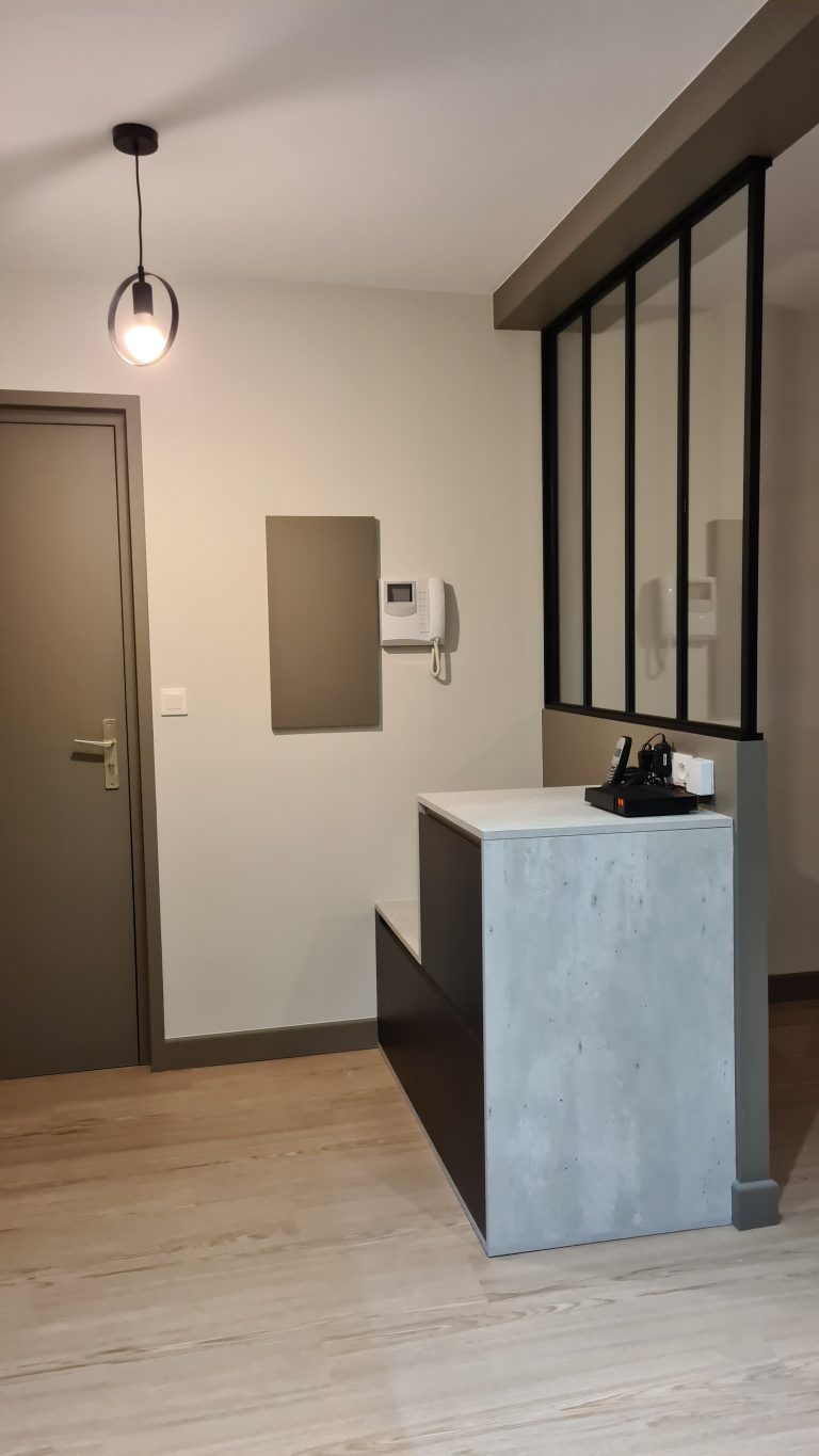 Cuisine moderne et fonctionnelle. Poignée profilé dans la façade. Belle verrière.