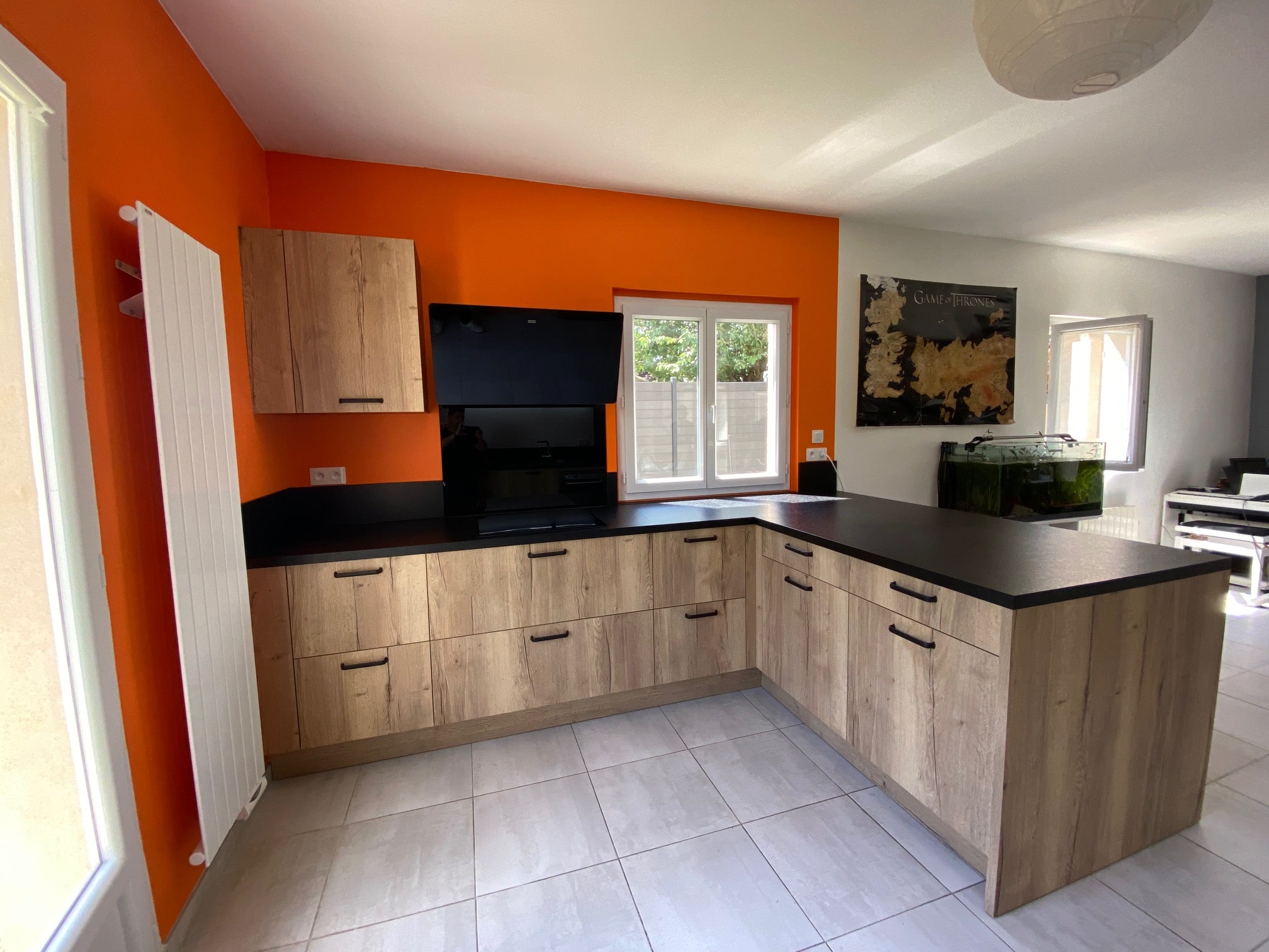Cuisine équipée avec un coin repas, les murs oranges mettent en avant cette cuisine aux façades bois. Nombreux rangements, électro-ménagers noirs et cave à vin sous plan. Four en hauteur dans une colonne, poignées noires.